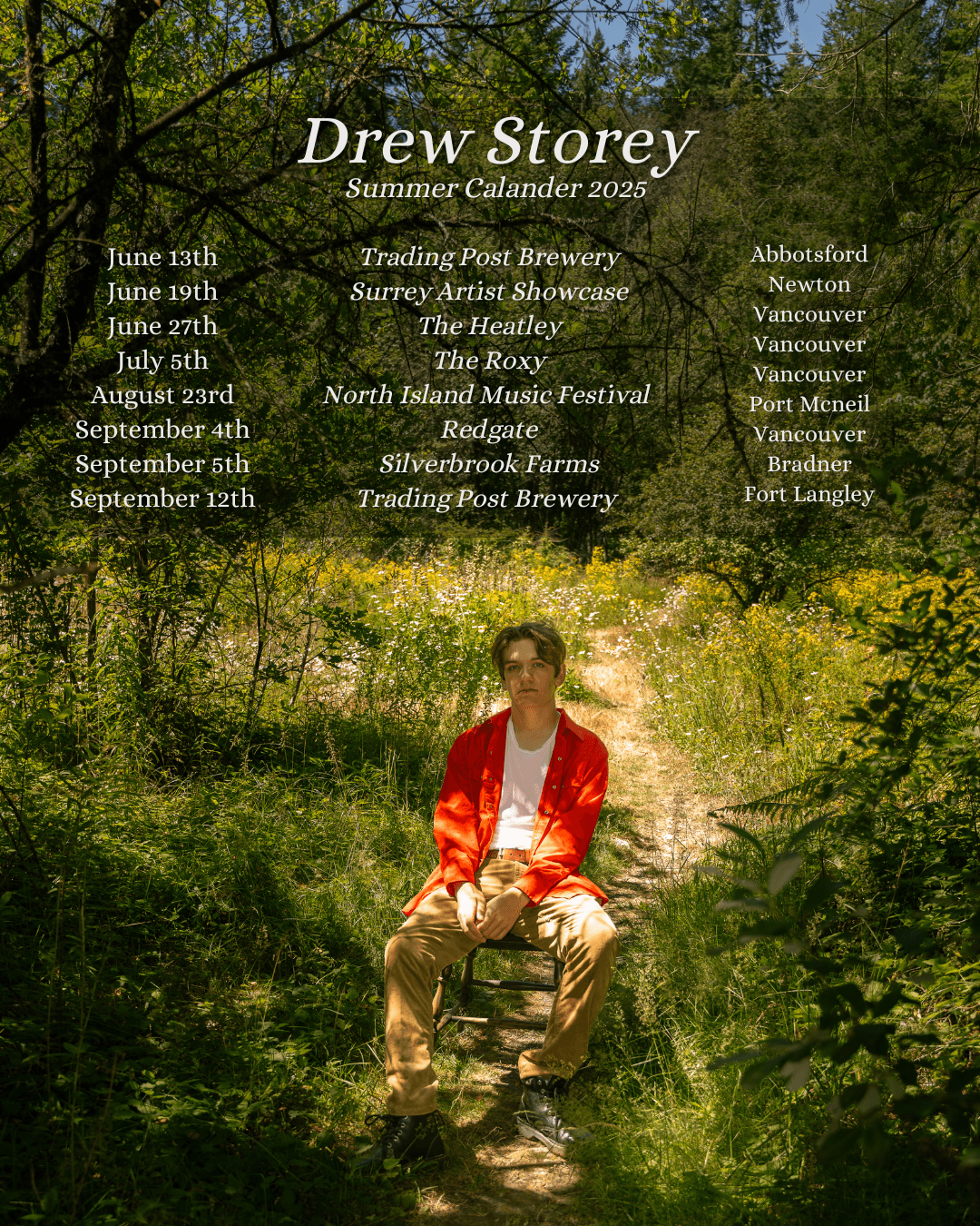 Drew Storey is an emerging singer-songwriter and band leader from Langley, BC, with a unique blend of introspective lyricism, pop hooks, and rock energy. Writing and performing as a solo artist since 2015, Drew captures the essence of personal reflection while delivering infectious energy and enthusiasm to further connect with the audience. His performances have been referred to as Rex Orange County meets Bruce Springsteen, blending thoughtful lyrics with creative, high-energy showmanship and nostalgic sounds. Drew's honesty and ear for melodies lead to him delivering one-of-a-kind memorable live acts and have made him an artist to watch in the indie scene. Since 2022, Drew has been leading his own band, further amplifying his sound and refining his live performances. To Drew, connection is the main goal, and he believes the only way that can happen is with complete musical and lyrical honesty.